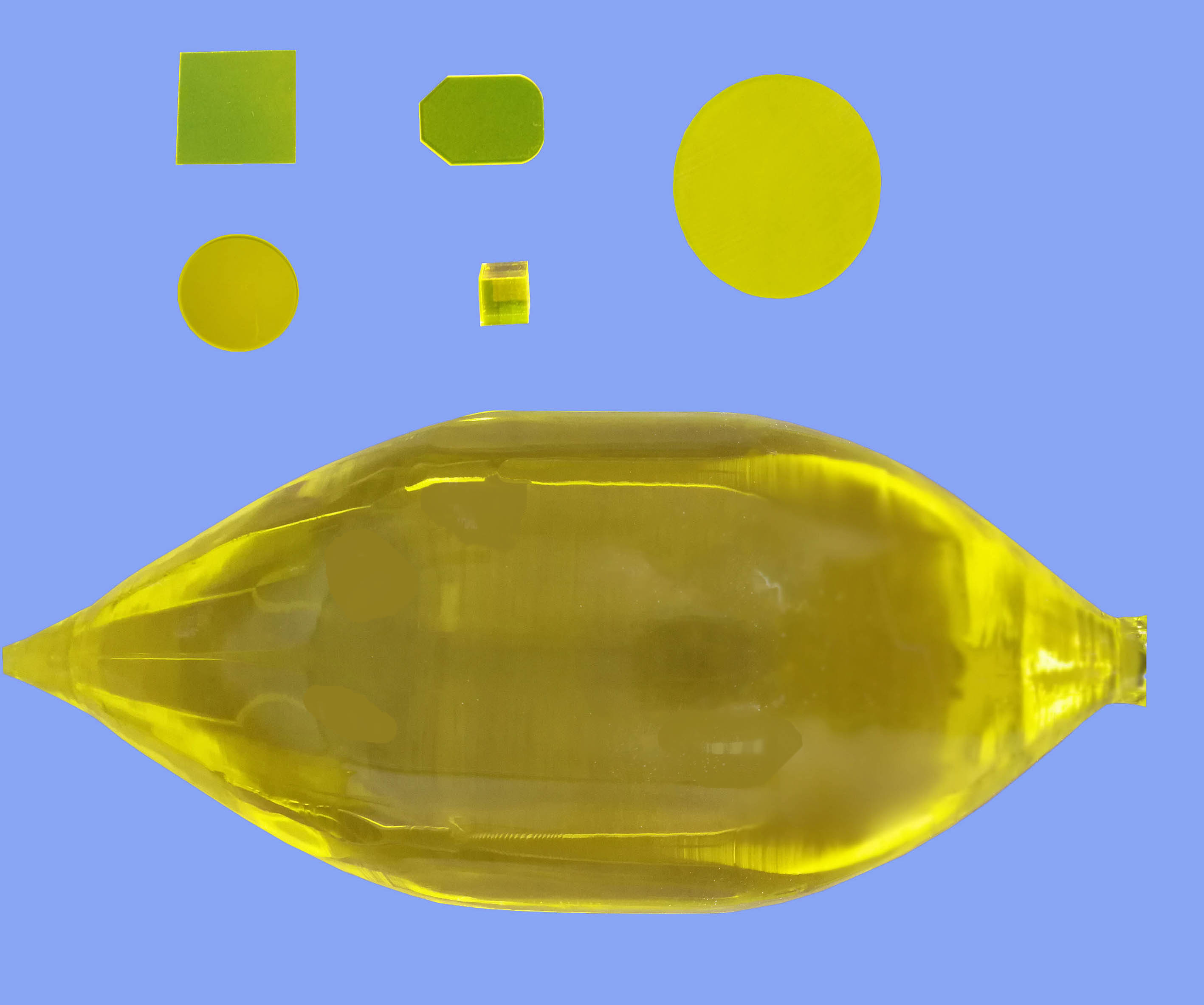 Ce:YAG單晶是一種性能優(yōu)良的閃爍晶體,其發(fā)光中心波長為550nm,具有較高光產(chǎn)額(9000Ph/Mev)和較快的衰減時(shí)間(75ns),可以與硅光二極管等探測設(shè)備有效耦合。且不潮解、耐高溫、熱力學(xué)性能穩(wěn)定,可以應(yīng)用于極端的探測環(huán)境中。
